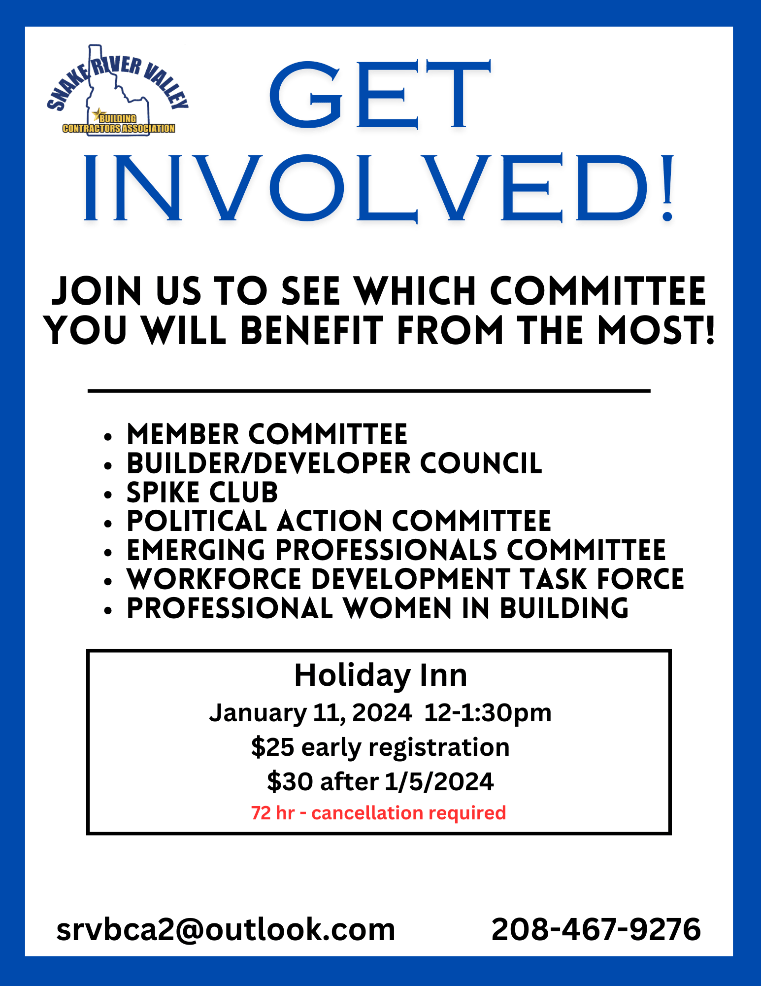 Being a member of the Snake River Valley BCA is more than just paying your dues. We have many opportunities to get involved and get to know your fellow SRVBCA members.